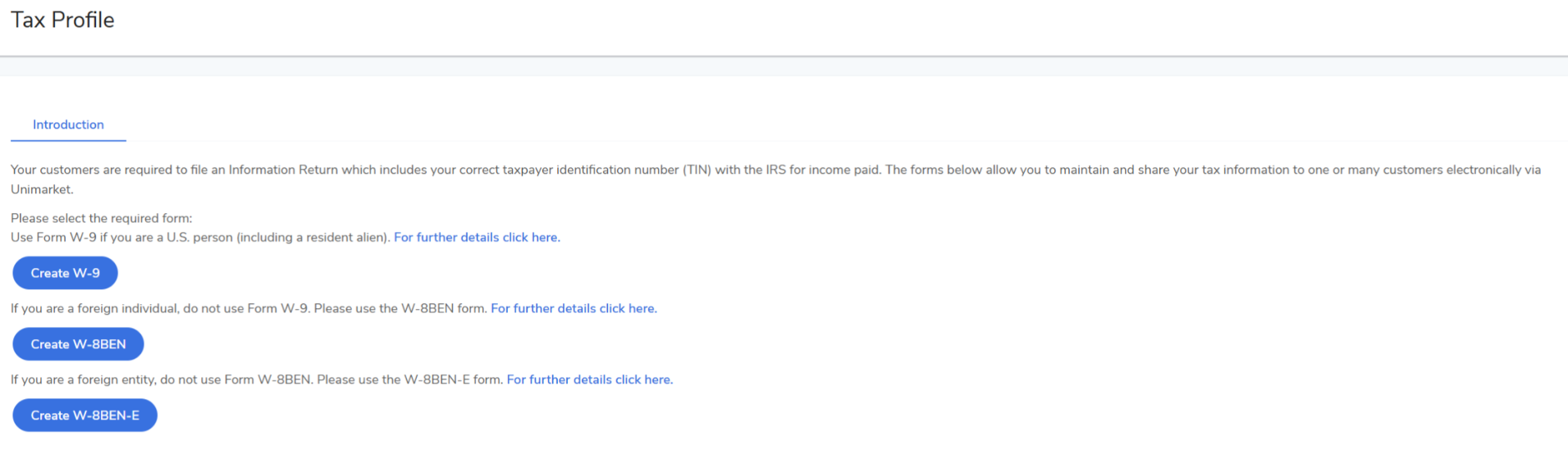 Tax Profile (US Suppliers only): If required by the customer, you will be directed to the Tax Profile page. Choose the appropriate form (W-9, W-8BEN, or W-BEN-E) and complete all mandatory fields. See the related help article Submitting & Updating Tax Profile.