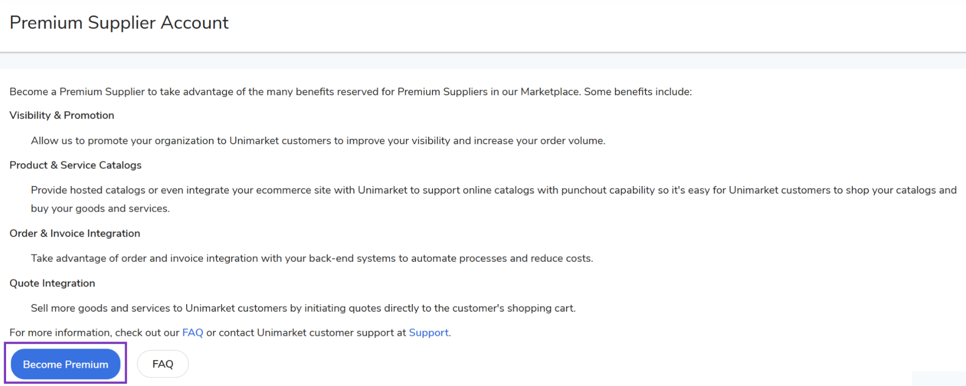 Upgrading your supplier profile to a Premium membership enables advanced features for your store, such as catalog integration, order and invoice automation, and quote integration.