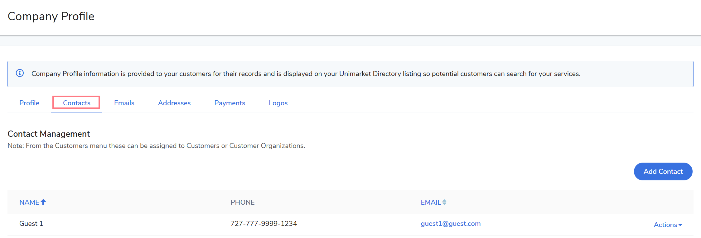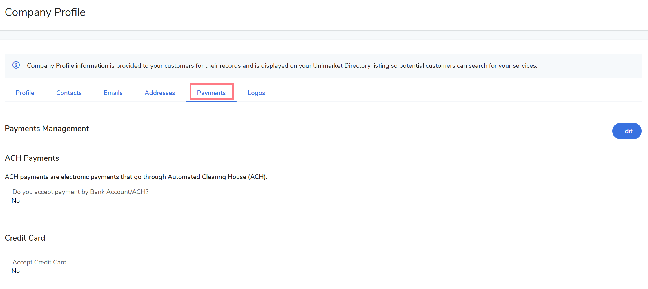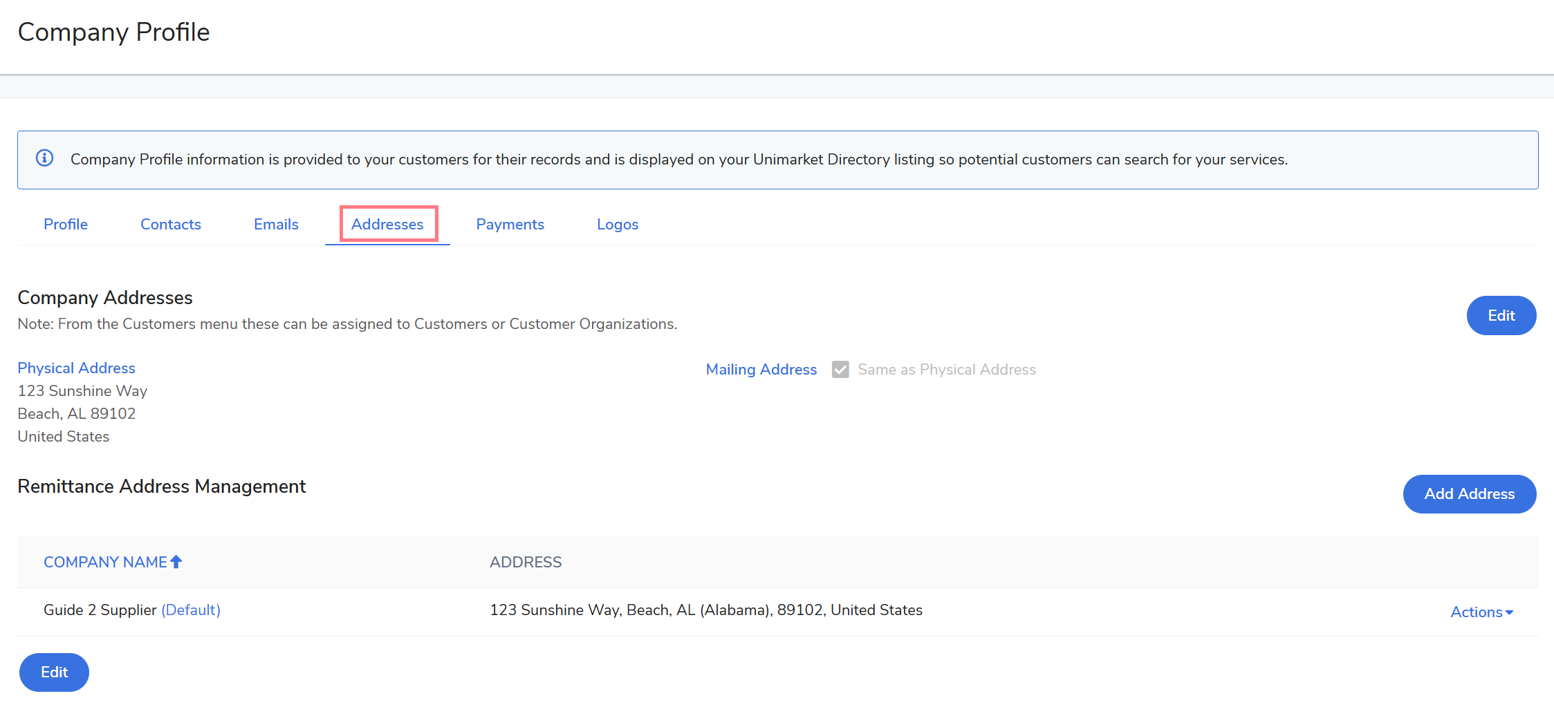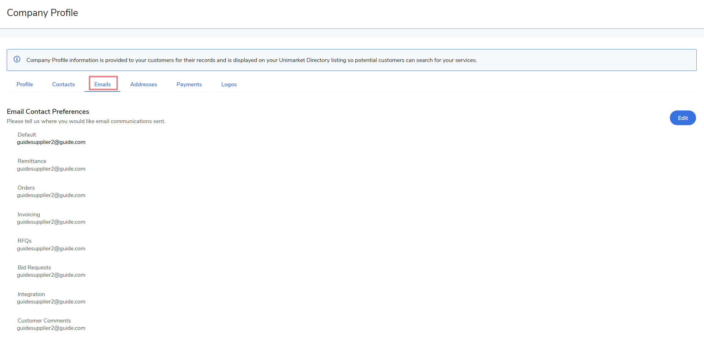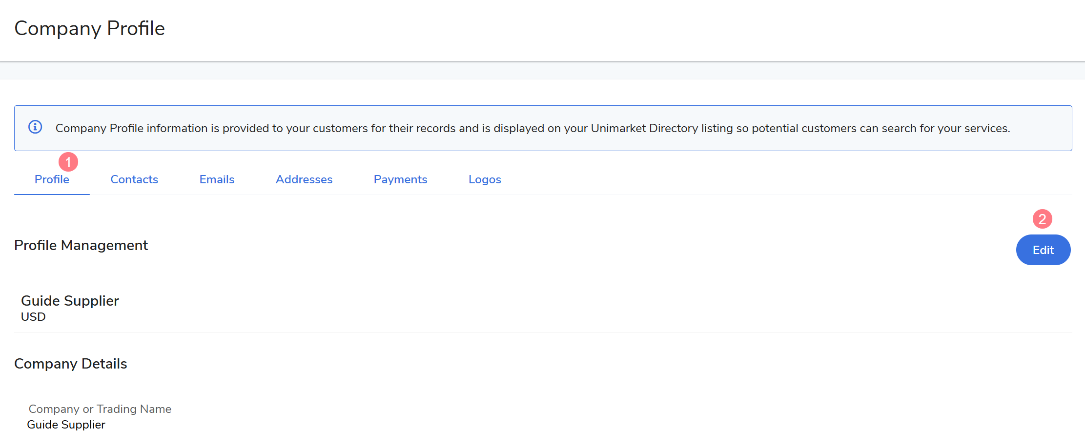 Company profile contains information available for your customer's viewing, that consist of your profile, contacts, emails, addresses, payments and logos. On the Profile tab, you can update your profile information by selecting Edit.