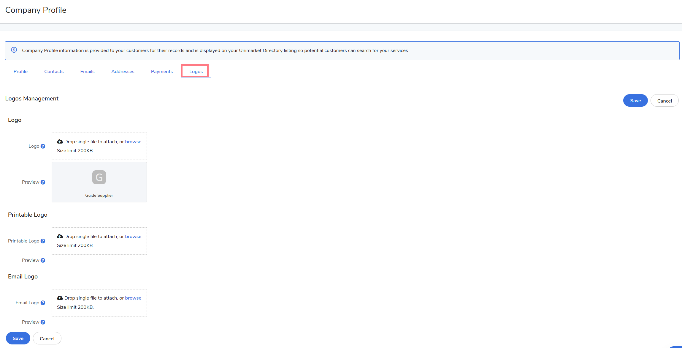 Suppliers can utilize their company brand logo for display in their store, directory, printable documents and/or emails.