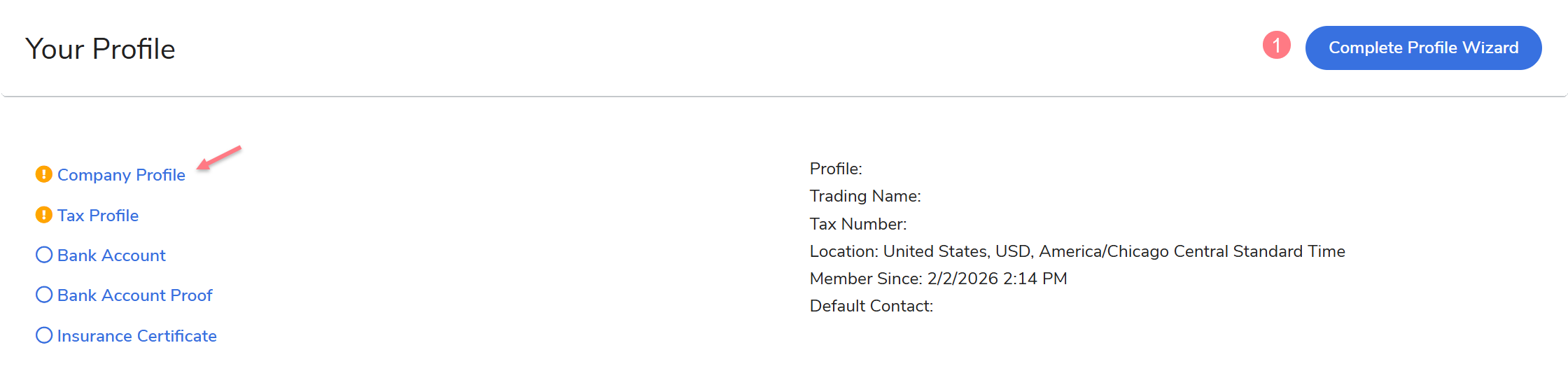 - Select Complete Profile Wizard and complete all required fields marked with a red asterisk. Once completed, click Save (at the bottom of the screen).
