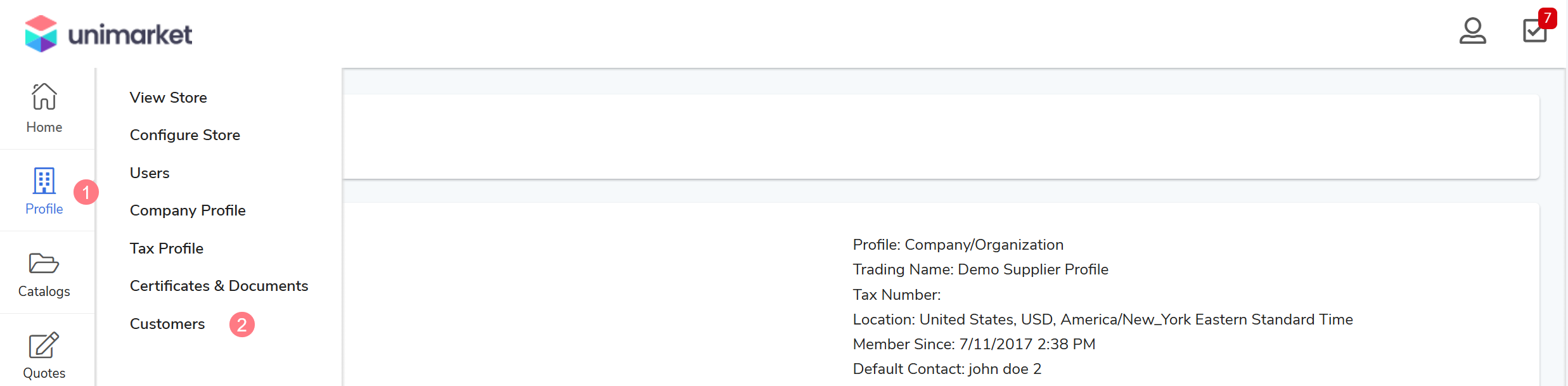 The Customers screen allows suppliers, to view all linked customers, check their trading status, registration requirements and manage the specific information (e.g., addresses, contacts, and email preferences); shared with each linked customer.