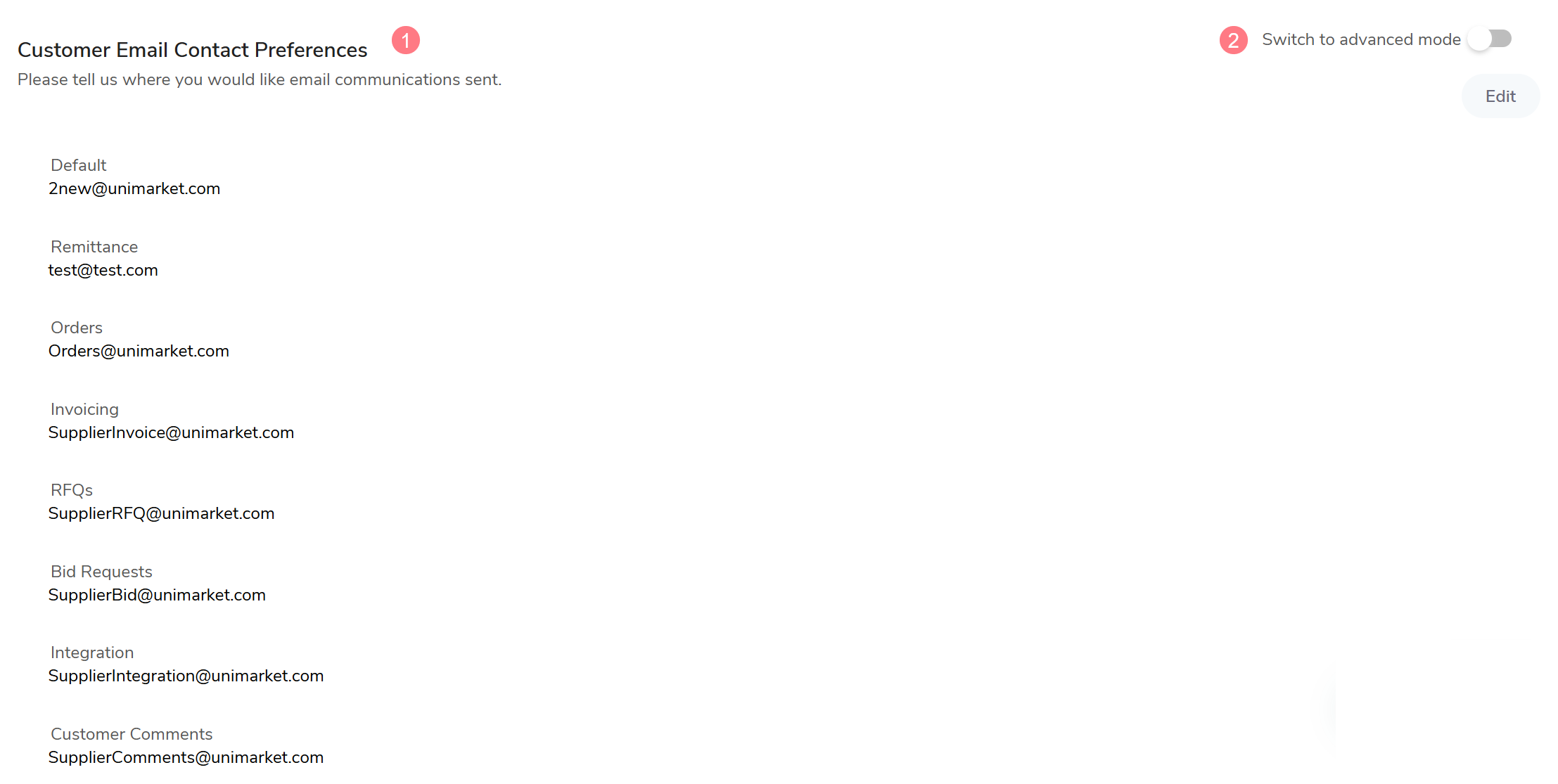 Customer Email Contact Preferences: Update the email address(es) to ensure you receive specific subject type email notifications. If you Switch to Advanced Mode, you can update these addresses for related customer notifications.