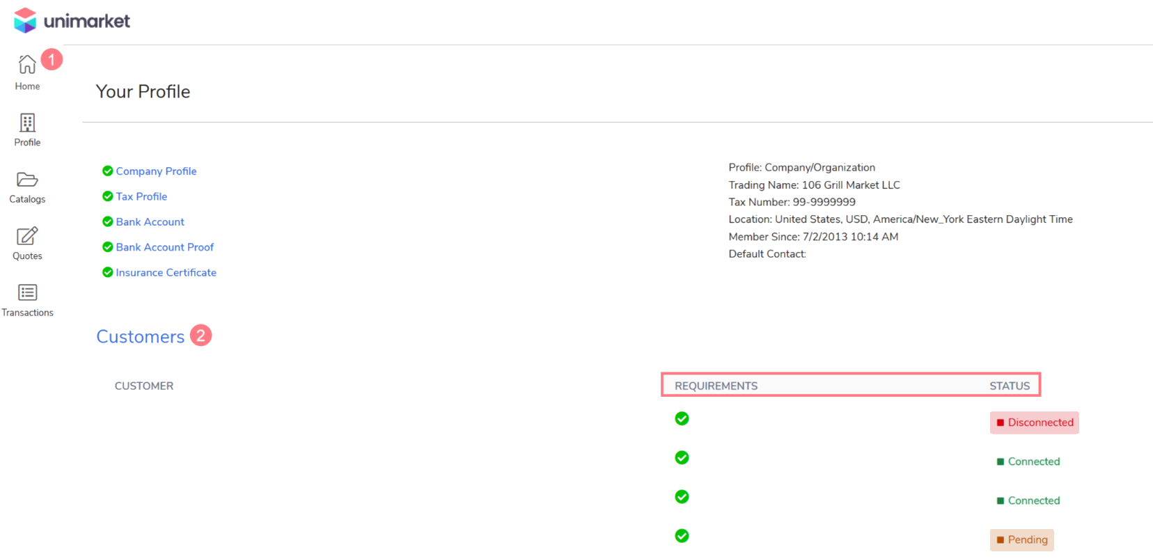 | Requirements | Hover over the icon. | A pop-up shows the customer's mandatory registration requirements and which portions of your profile are completed. |