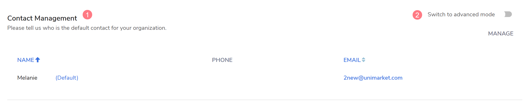 Contact Management: The desired contact person is assigned here. If you Switch to Advanced Mode, you can update the contact person for this specific customer without changing your profile's default contact.