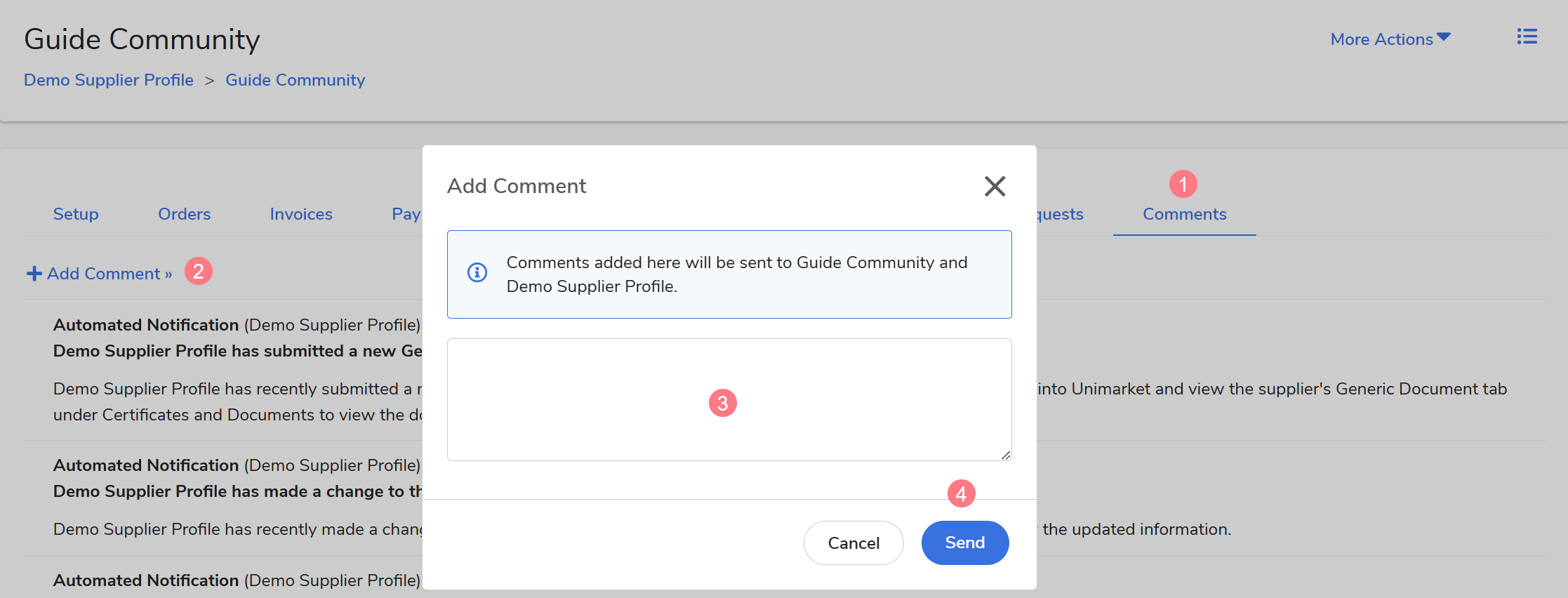 Select +Add Comment. Your comment will be sent as a notification to your customer and housed here.