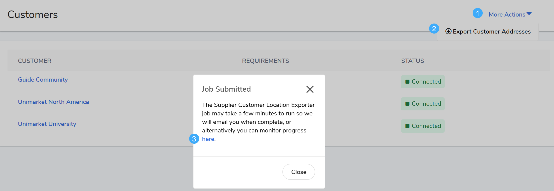 Suppliers can export a list of a connected customer's addresses, for delivery and billing purposes. To review and update their records.