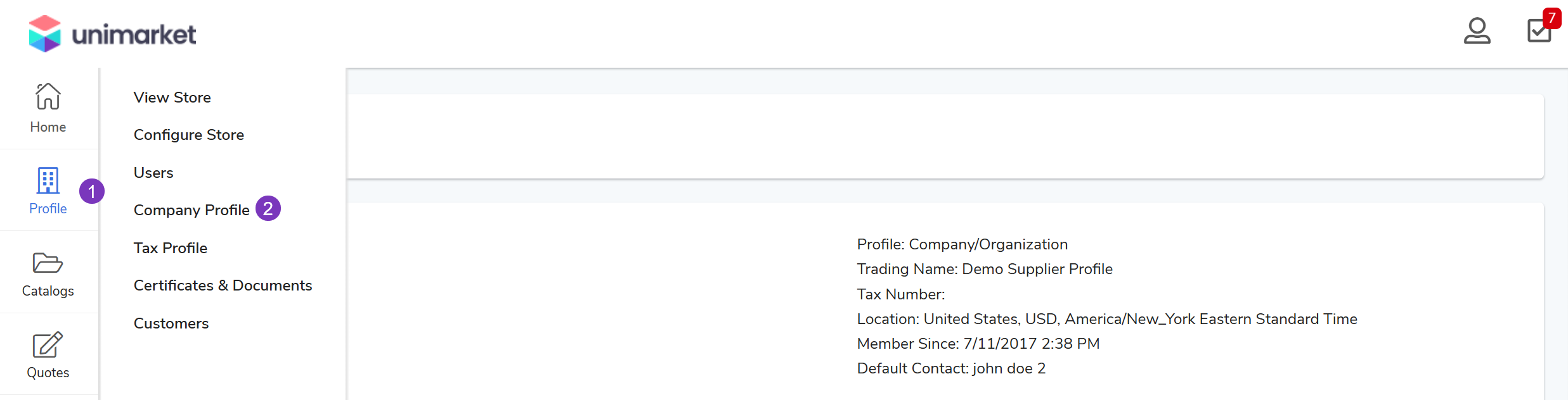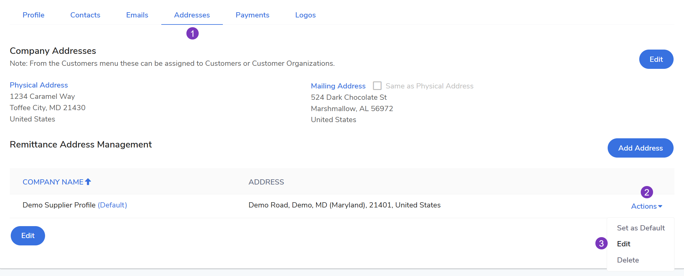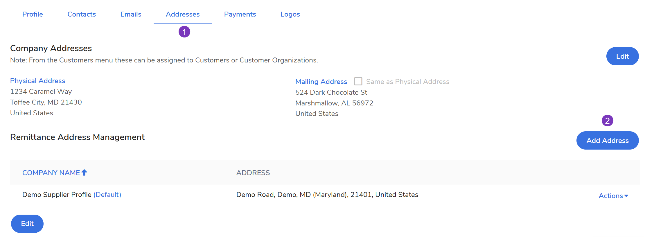 Suppliers can update their profile's Physical, Mailing, and Remittance addresses to ensure connected customers have the most accurate information for purchase orders and payment processing.