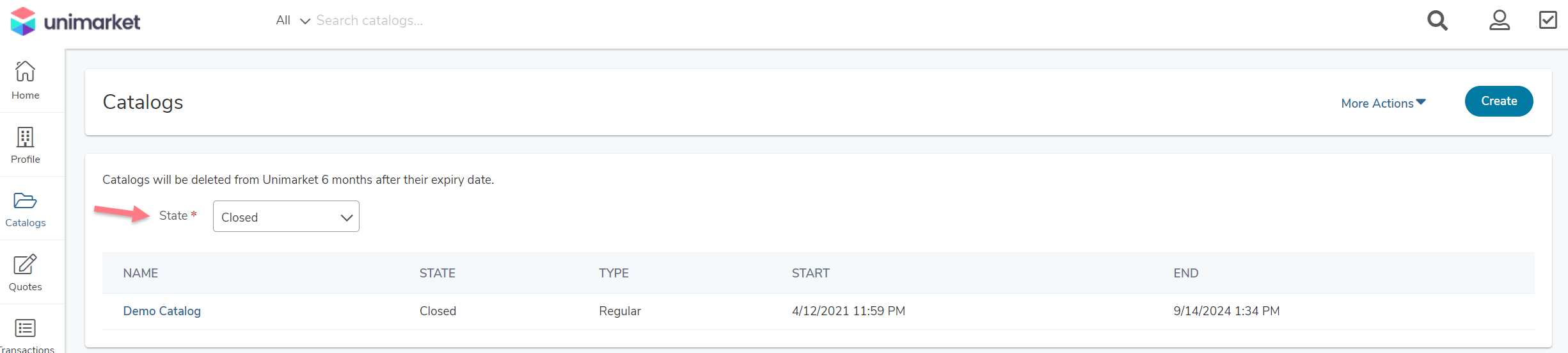 | Closed Catalogs (No longer active) | 1. Ensure the State filter is set to Closed. 2. Select the desired catalog name. 3. Select More Actions. 4. Click Export Draft Products. |
