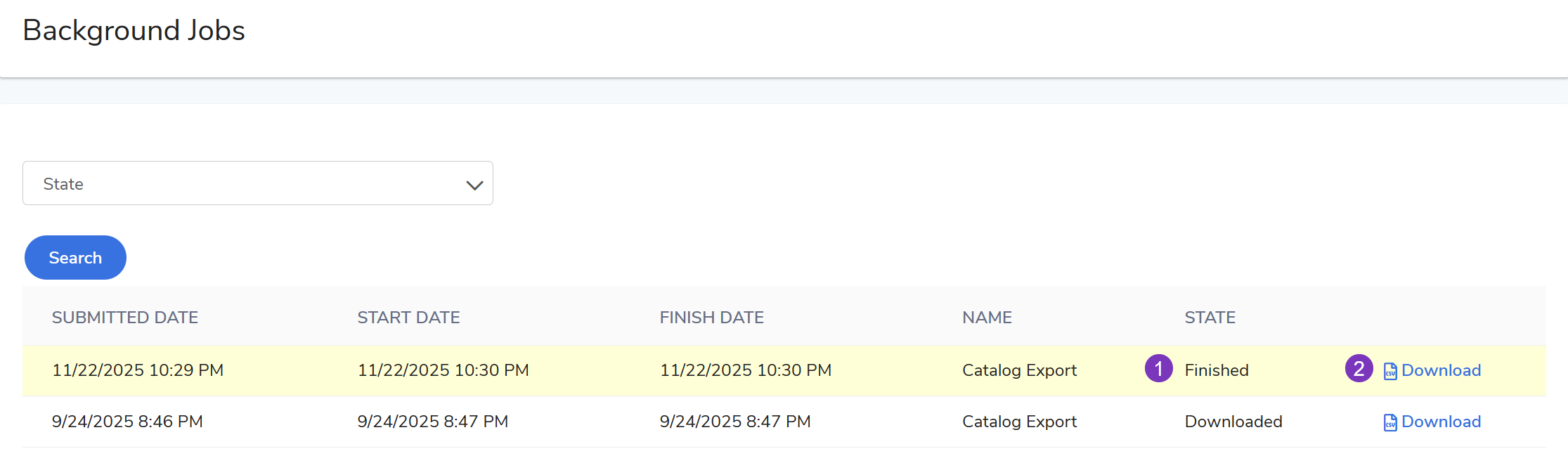 Tip: You can also access this screen by selecting the Task Menu in the upper right corner and clicking Background Jobs.