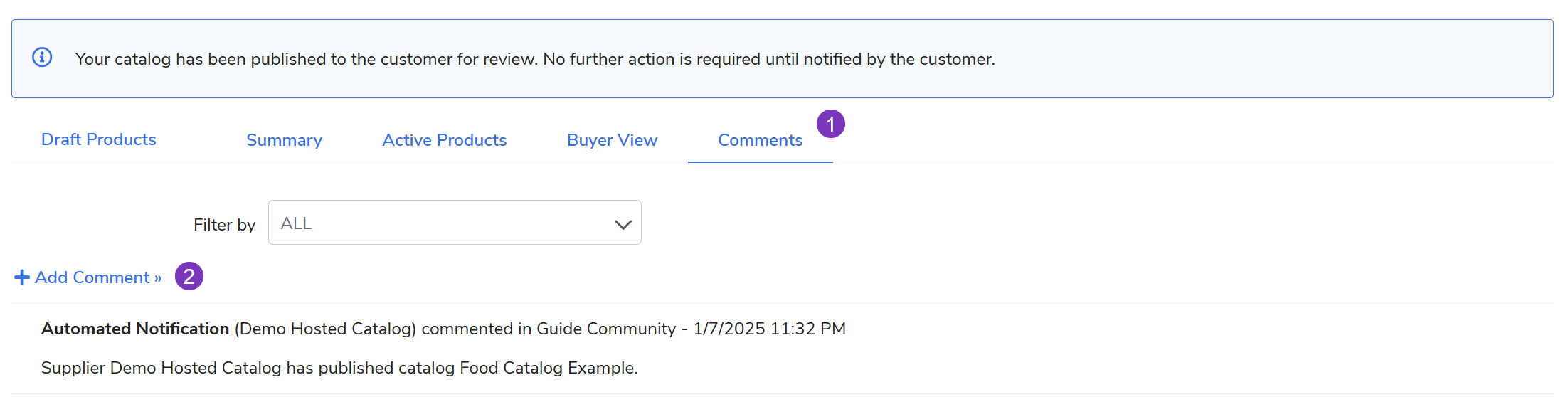 | Comments | Facilitates communication between the customer and supplier regarding the catalog review process. | A comment is automatically created when a new catalog starts, notifying both parties via email. |