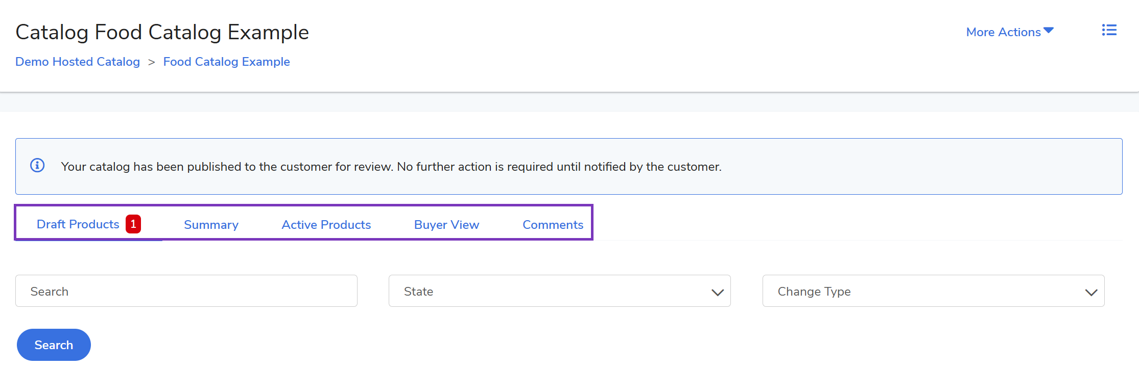 Suppliers can access the View Catalogs screen, to see all their catalogs (e.g., check their status, view and edit active products, manage products in draft, and communicate) with customers via the Comments tab, during the catalog review process.