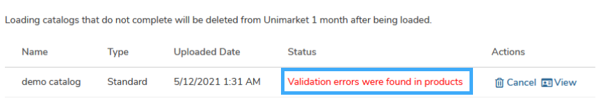 | Validation errors were found in products | Information provided did not meet the file upload criteria (e.g., trademark/copyright icon included). | Click View to see the error(s). Manually Update the item in Unimarket and select OK. |
