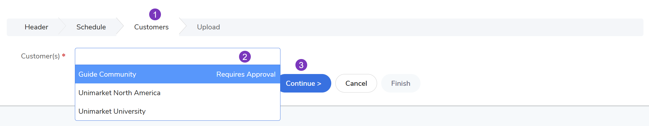 Note: If Requires Approval appears next to a customer's name. Catalog Approval is enabled by that customer and you may be unable to add additional customers, if that specific customer is chosen.