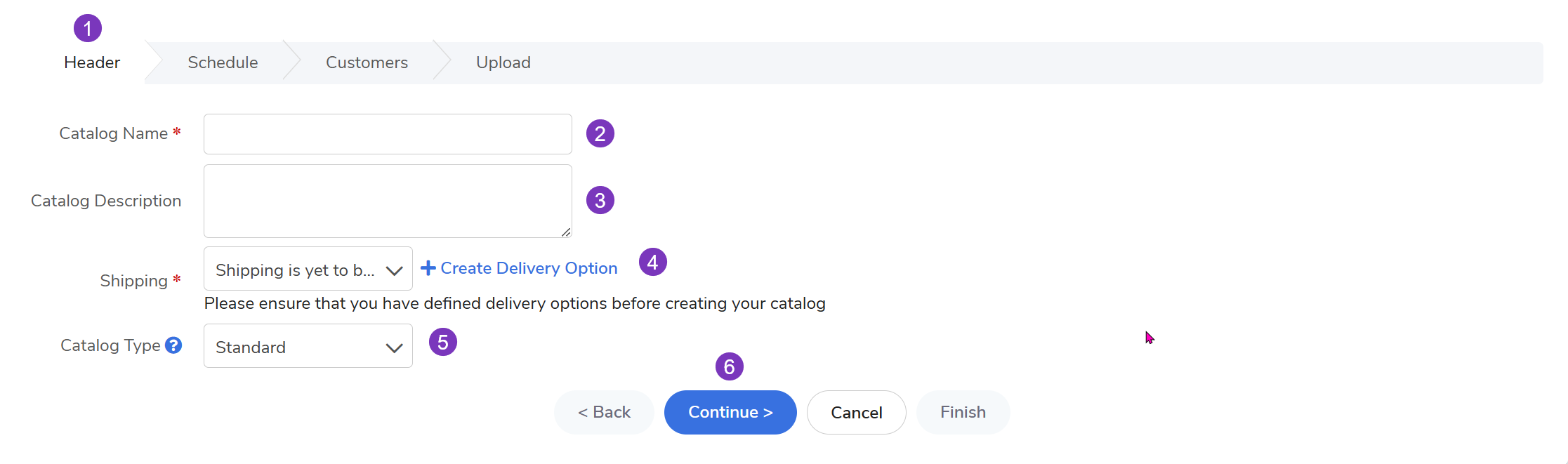 | Shipping | Select from the pre-determined drop-down list. To learn more about on how to Create Delivery Options, refer to help article Creating Shipping Options For Your Hosted Catalog. |