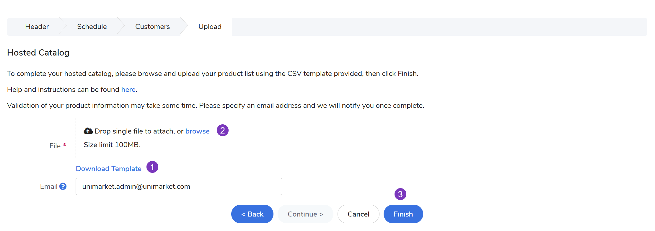 File: Catalog data must be prepared in a CSV or ZIP file utilizing the Unimarket catalog template.