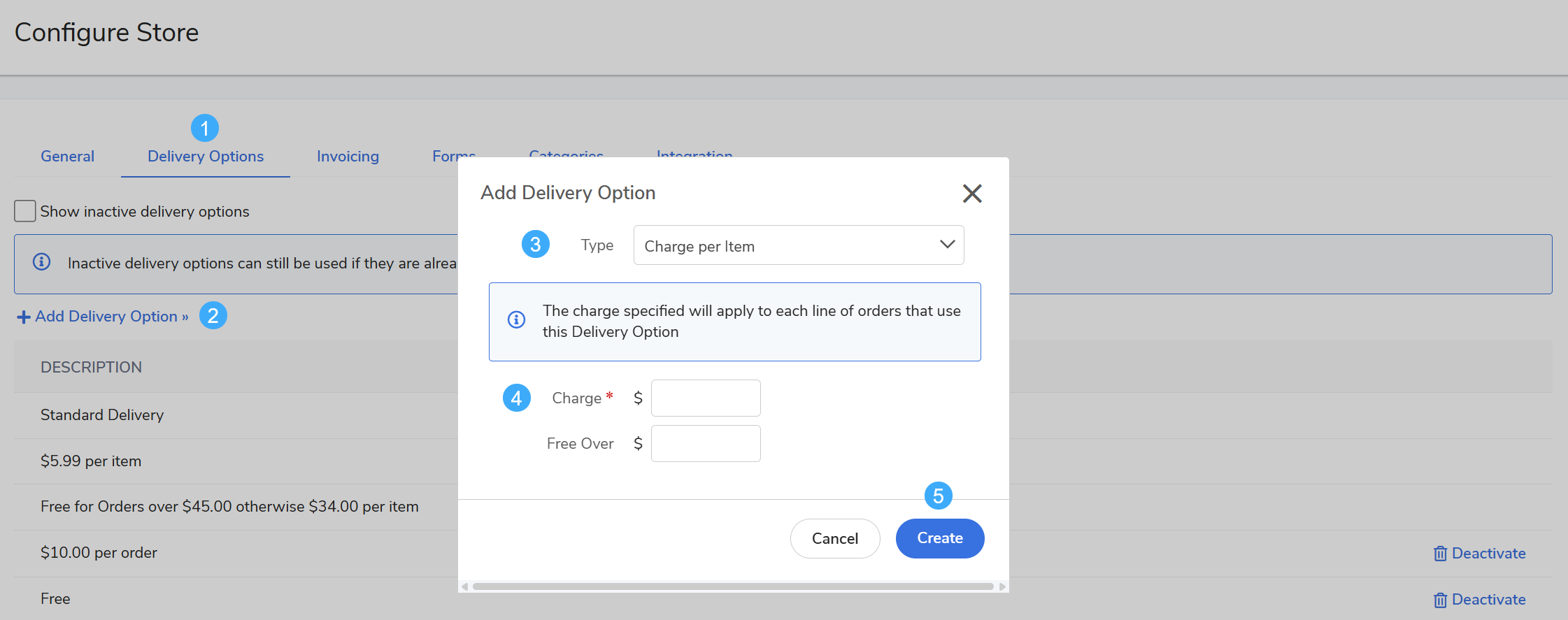 | Charge per item | The specified charge will apply to each line of orders that use this Delivery Option. |