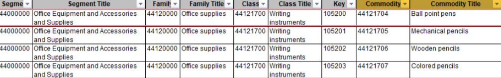 Example Code: The full UNSPSC code for "Ballpoint pens" is 44121704.