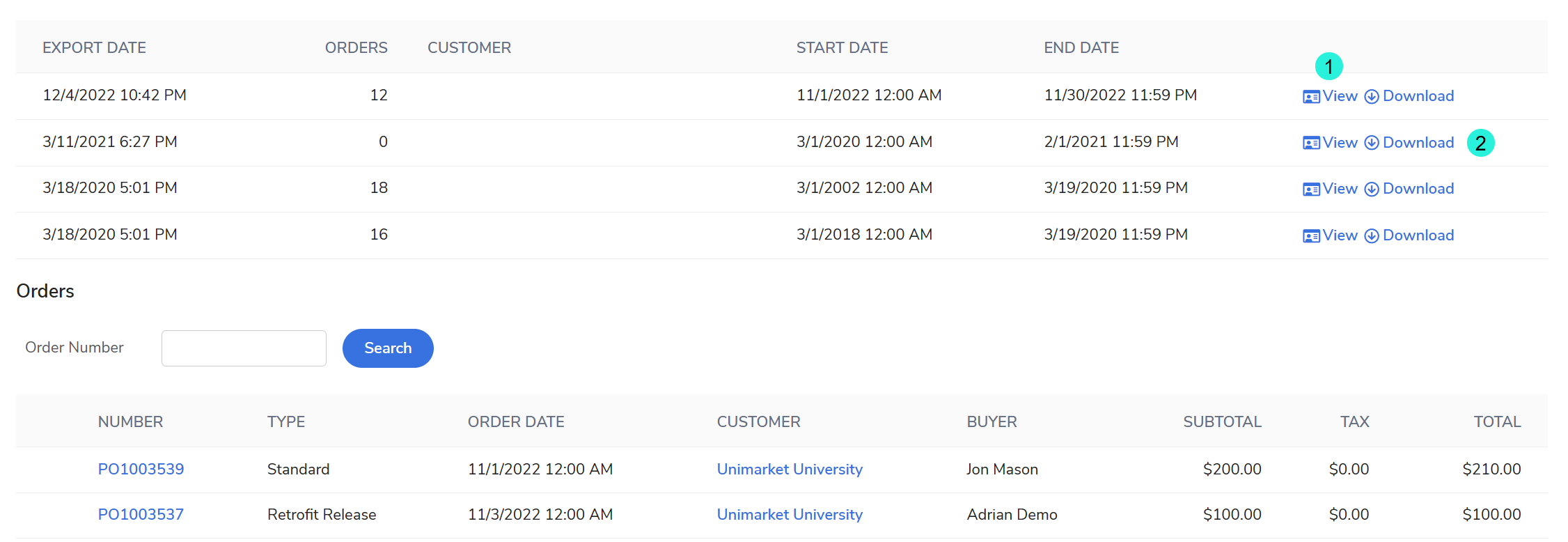 Select View, to view the orders in the listing below or select Download to receive an order export file.