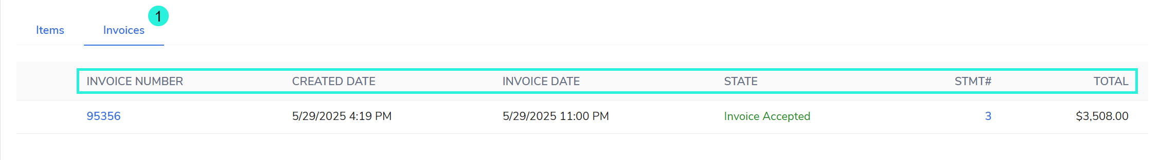 The Invoices tab provides a summary of all invoices placed against the desired order, including the Invoice Number, Created Date, Invoice Date, State, Invoice Statement number, and Total.