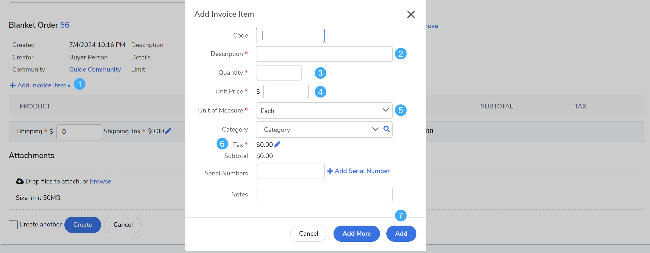 The Add Invoice Item pop-up box will appear. Key in information in all required fields marked with a red asterisk.