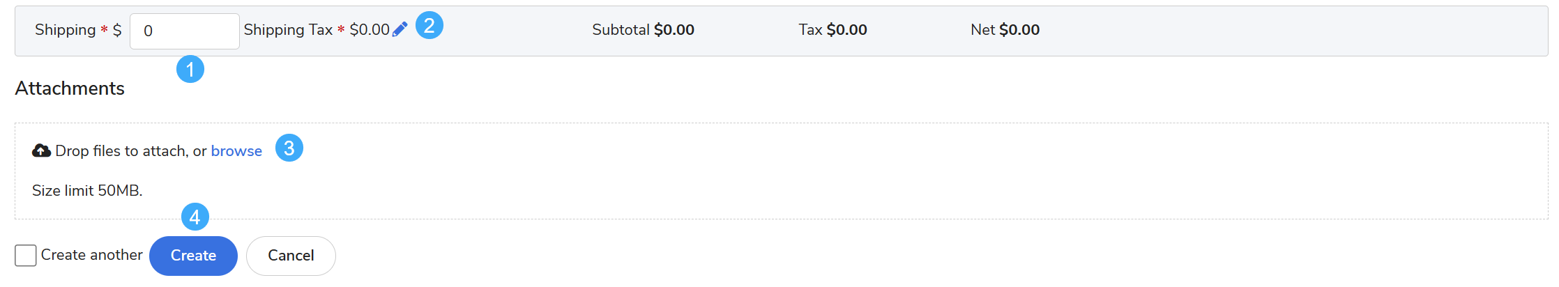 Shipping: If shipping charges are required, key in the amount in the Shipping field. If shipping tax is required, click the pencil icon in the Shipping Tax field to update the shipping tax.
