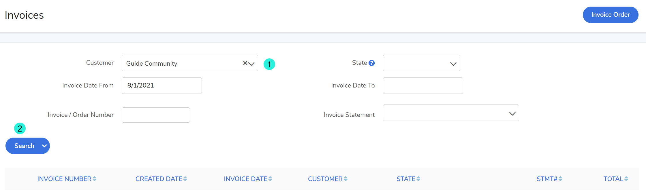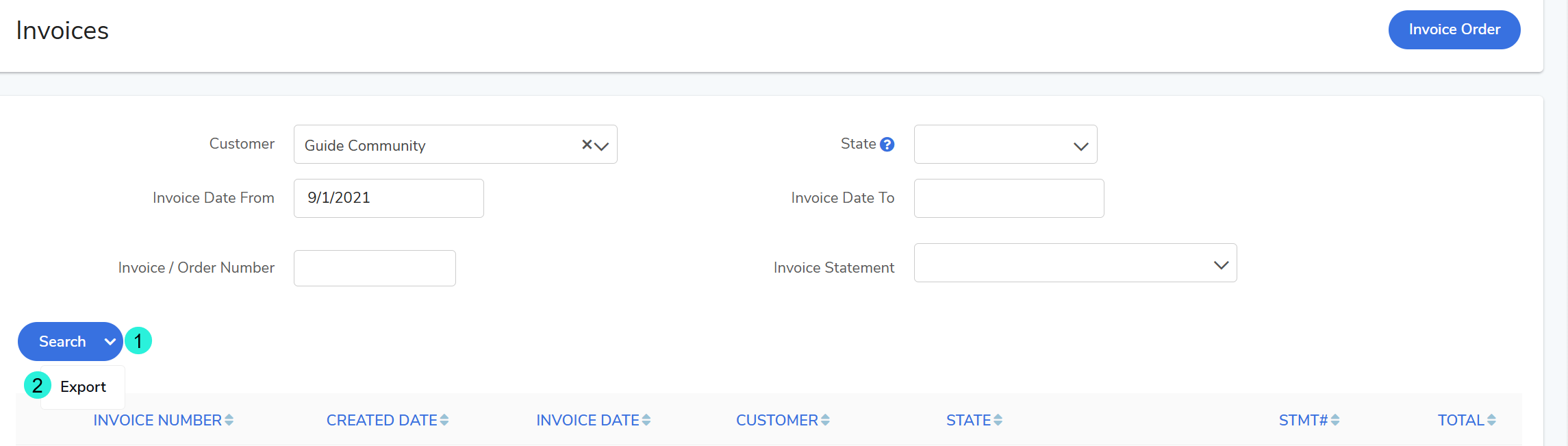 Use the Filters at the top of the screen (Customer, State, Invoice/Order Number, or Invoice Statement) to refine the invoice listing to only include the data you need for the report.
