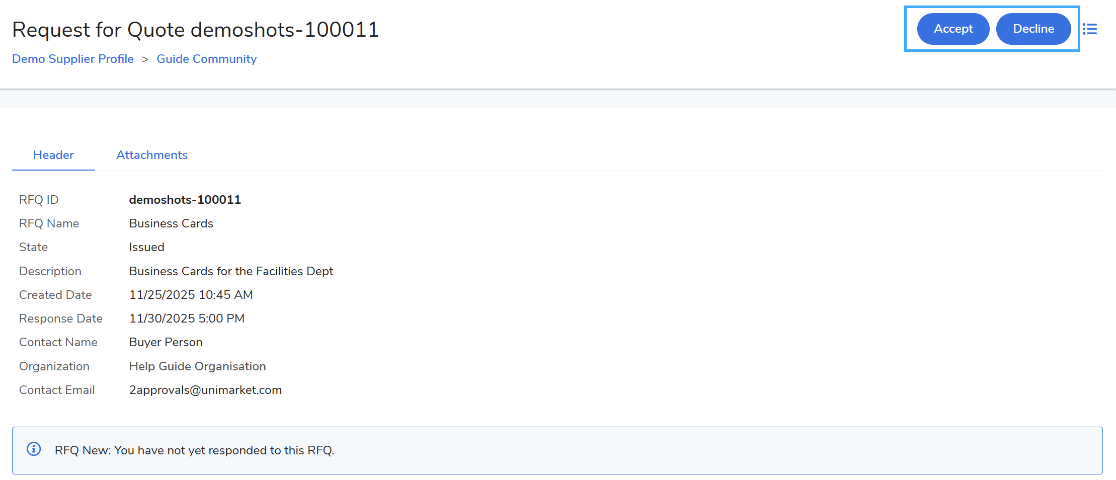 A notification will be sent to the buyer, informing them of your intent to respond (or decline) the RFQ.