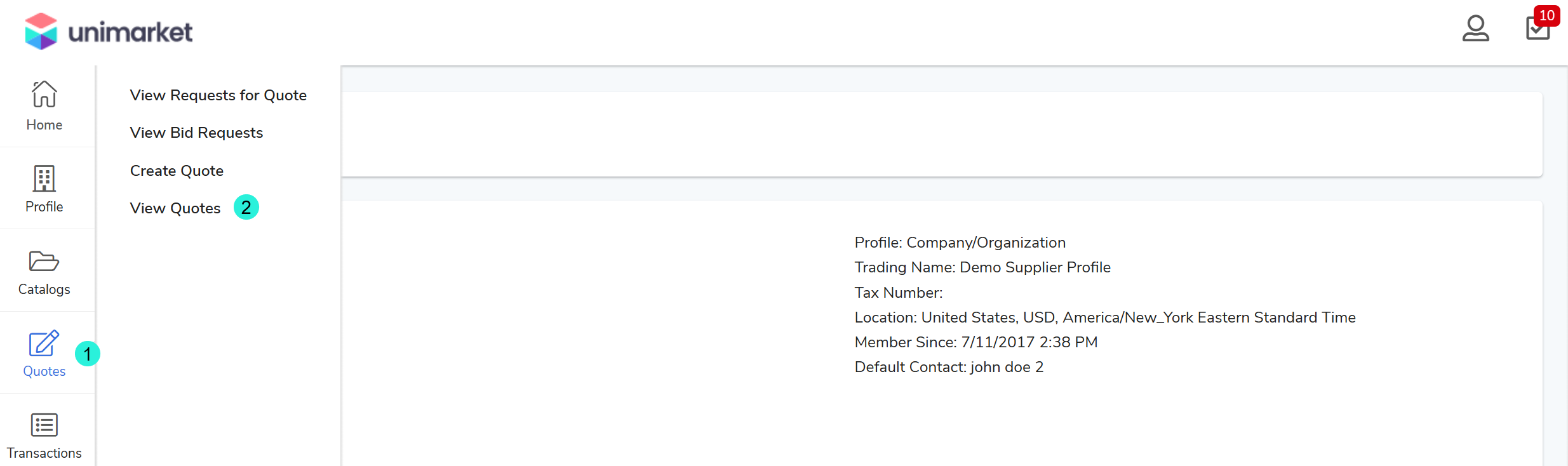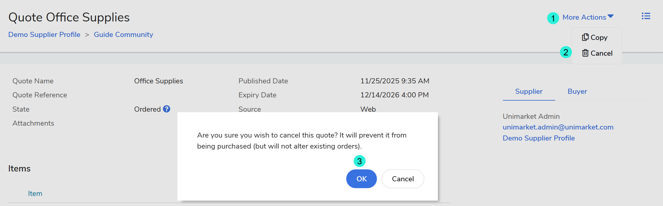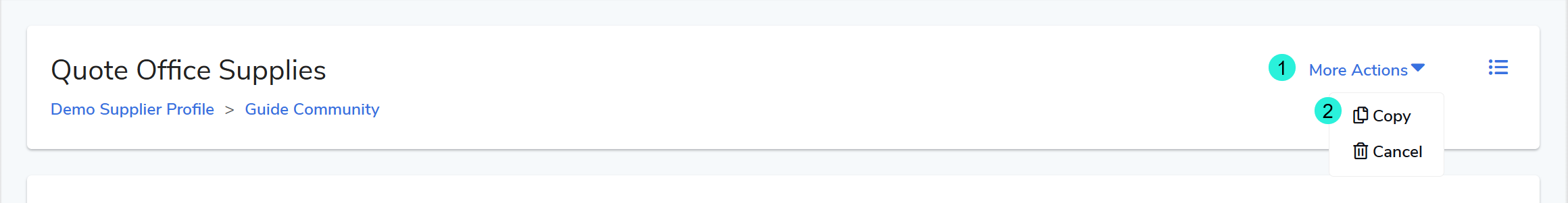 Suppliers can easily review the details and status of quotes they proactively submitted to customers. Additionally, the platform provides quick actions to Copy a quote for reuse or Cancel a quote before the customer accepts it.