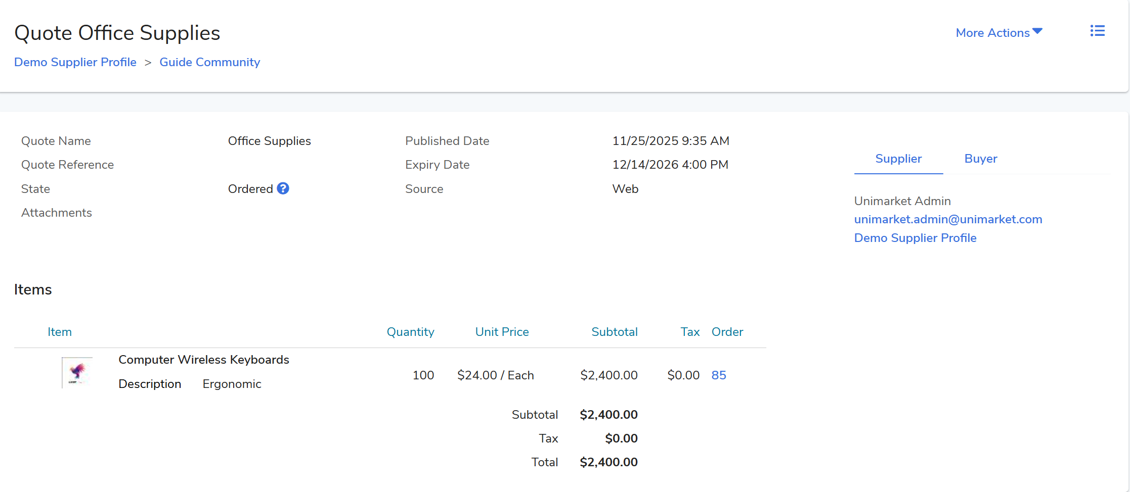 The desired quote screen will appear, allowing you to review information such as the Published Date, State, Expiry Date, and Attachments (if provided by the supplier at the time of creation).