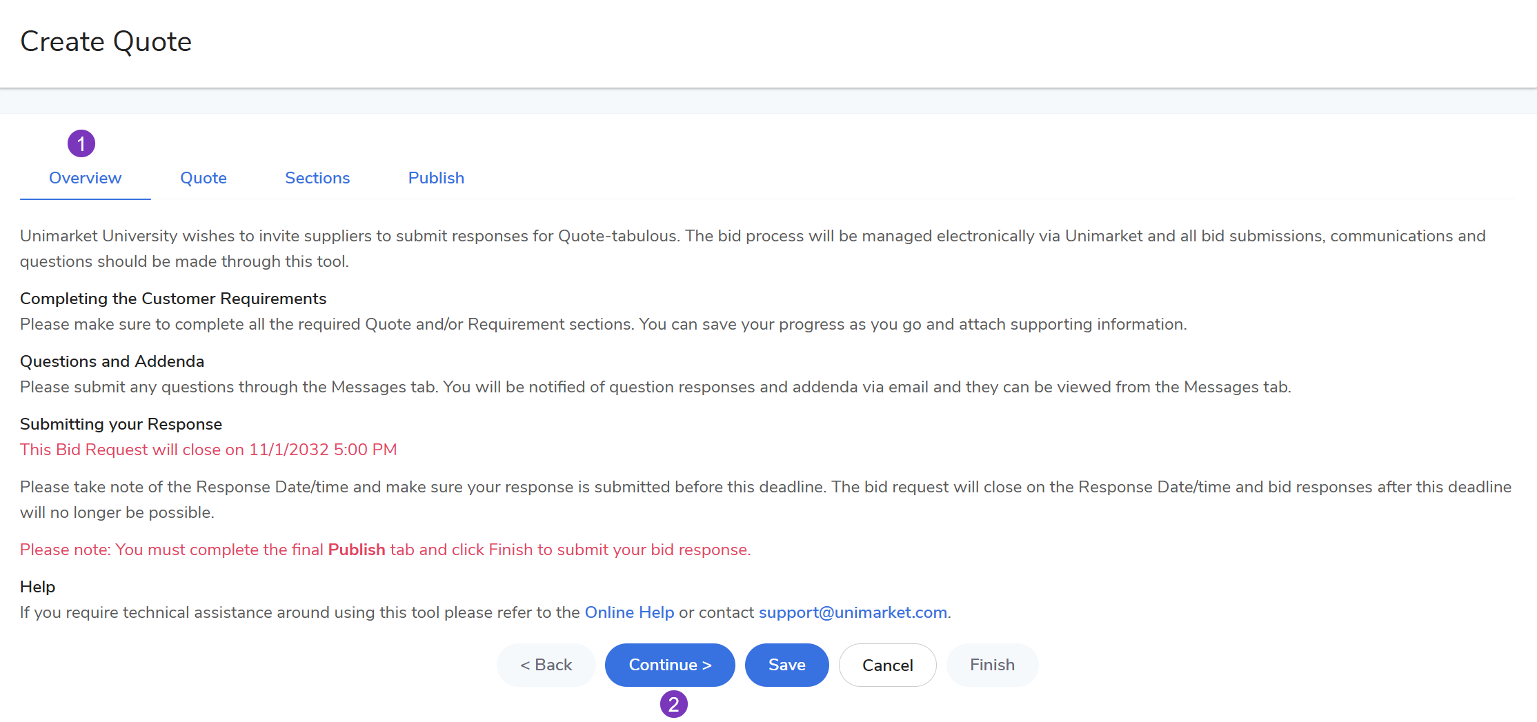 Once the supplier is satisfied, select Continue at the bottom of the page or select any of the subsequent tabs to begin the quote submission process.