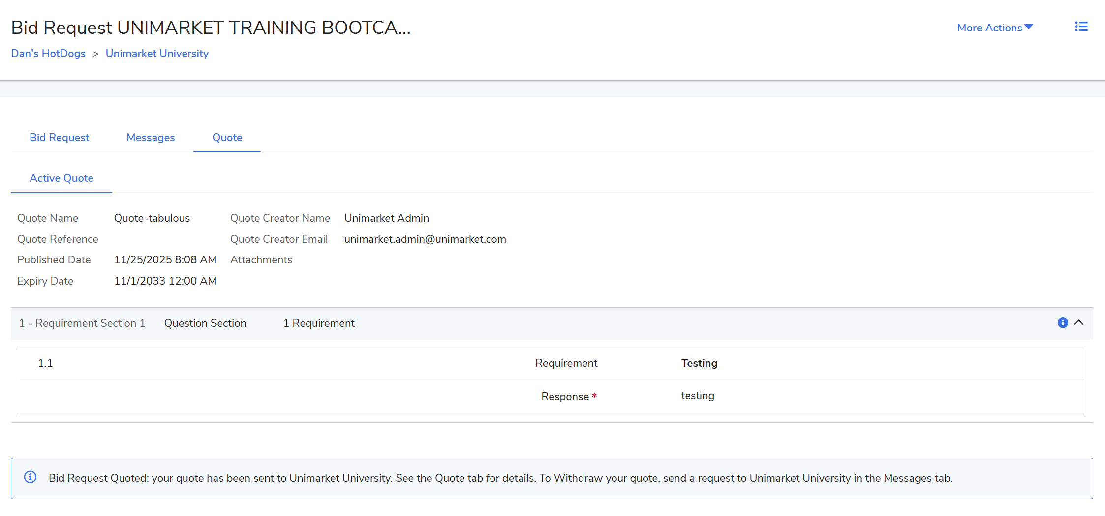 The desired quote screen will appear, where you can review information on the following tabs: Bid Request, Messages, Quote, Attachments (if included by the buyer), and Sections. You can also view your full quote submission and any attachments you included.
