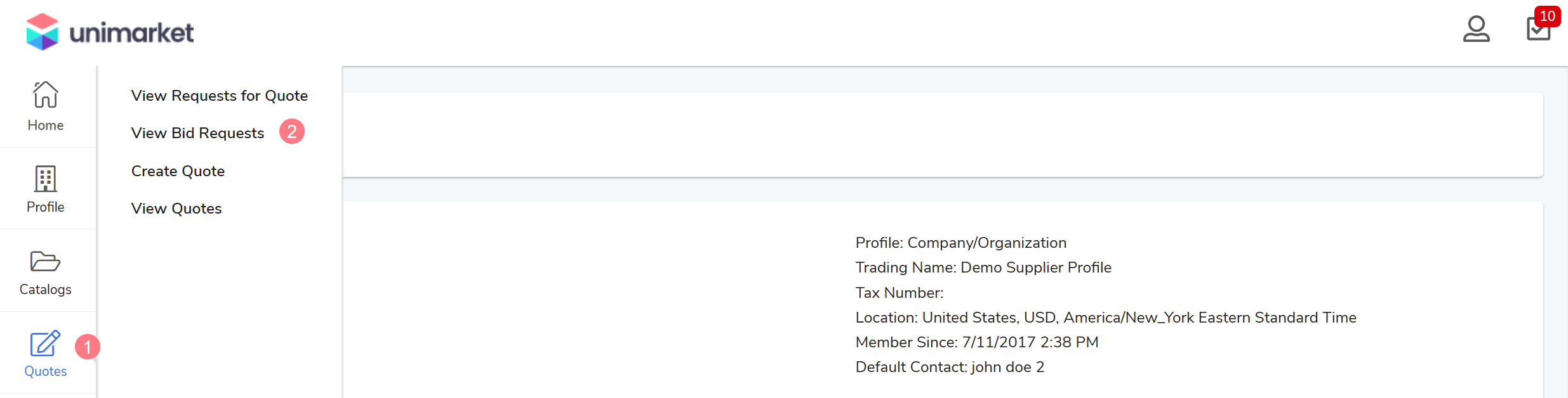 Suppliers can review the status and details of quotes submitted for customer bid requests. Quotes can be edited up until the bid response date or until the customer checks out the quote. Suppliers also have the option to withdraw a quote entirely before the due date.