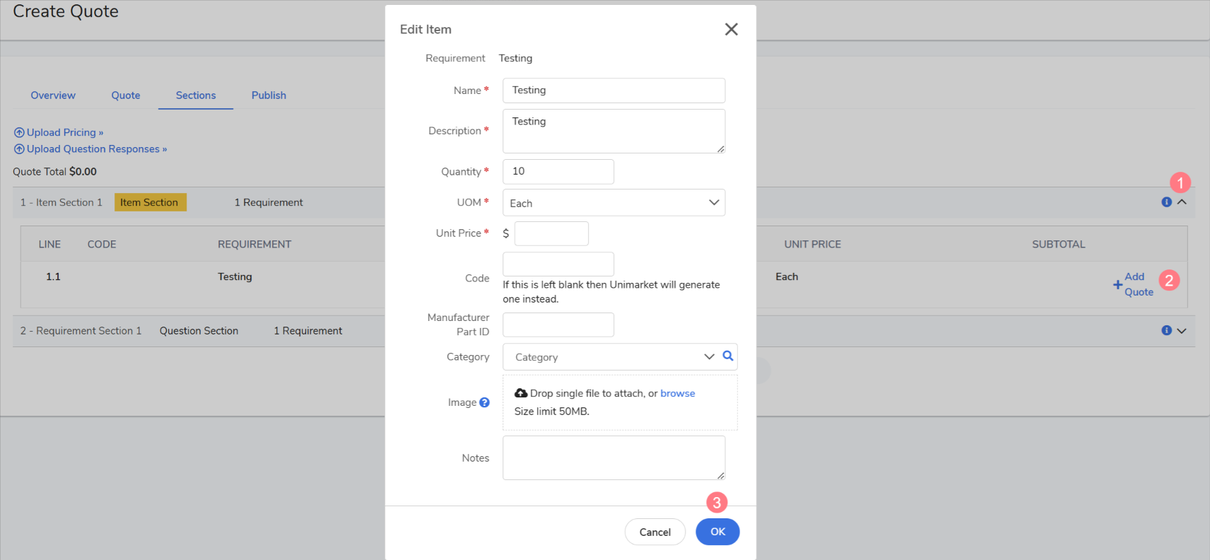 1. Select the dropdown next to the encircled "i" to the right of the line item. 2. Click +Add Quote to enter new pricing or Edit to modify an existing entry. 3. Enter the pricing details. 4. Select OK. |