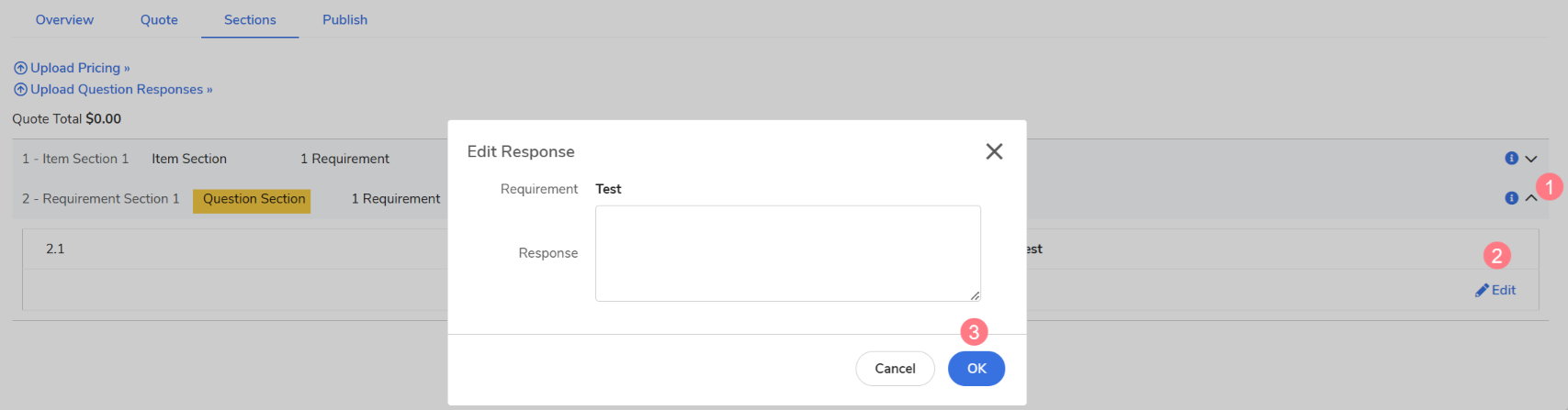 The Sections tab is where suppliers provide their item pricing and answer any mandatory questions required by the customer as part of the bid request. This tab is typically separated into Items (for products/pricing) and Questions (for qualitative responses).