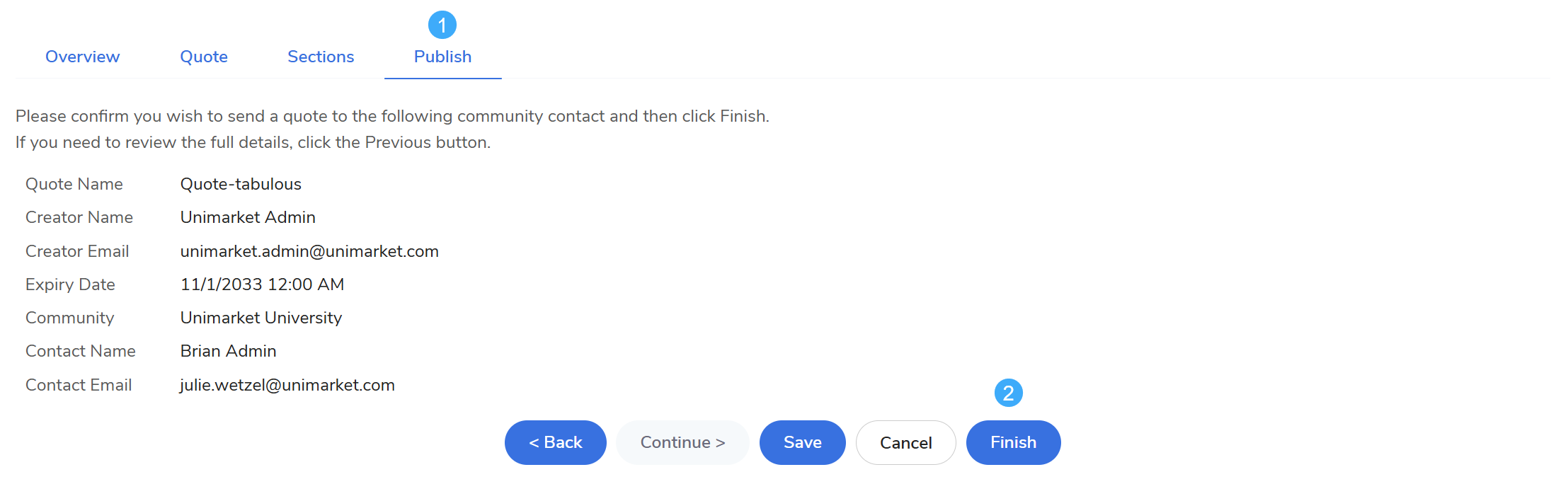 Customer Visibility: Your quote is not visible to the customer until you click Finish on this tab.