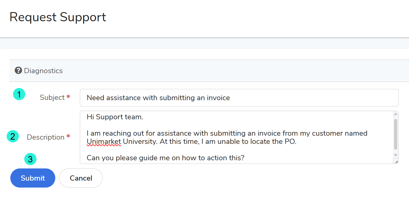 The Request Support screen will populate. Fill out the form, being as descriptive as possible and including your name and company information.