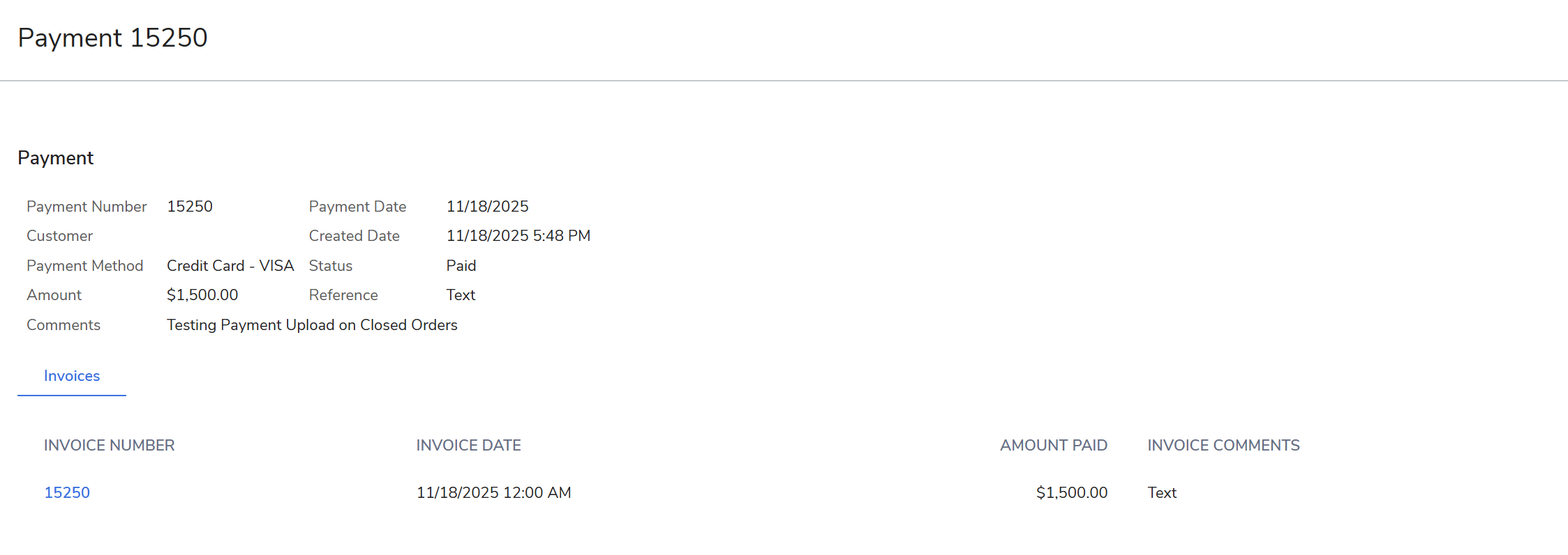 Additionally, you can view the invoice details related to the payment on the Invoices tab.