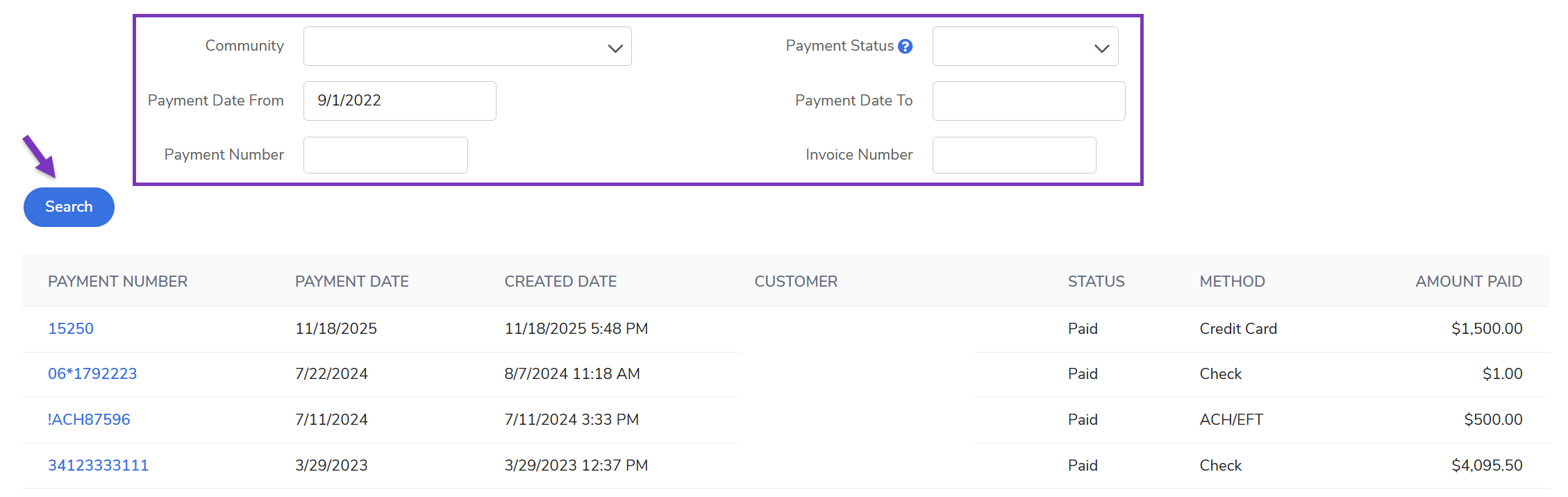 The Payments screen will appear, allowing you to customize search results using the following filters: