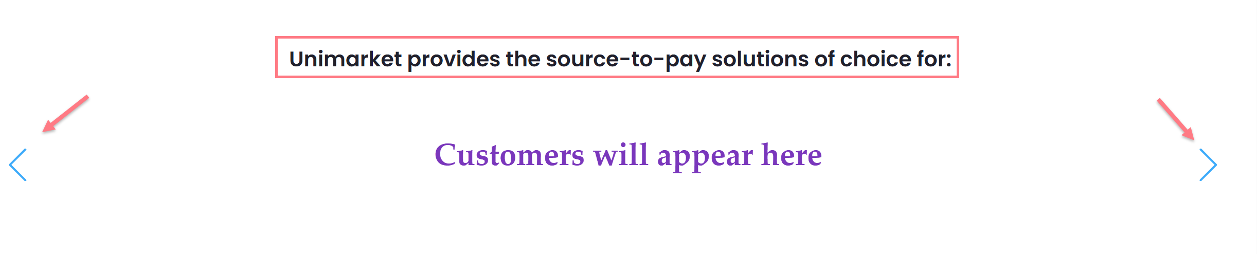 Customer's name and logo will appear under header titled, Unimarket provides the source-to-pay solutions of choice for > click the left or right arrow, to locate desired customers.