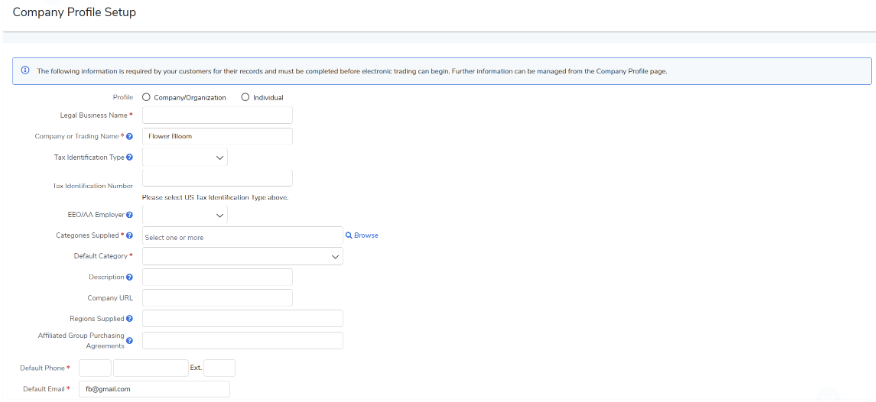 Once registration is successful, you will be taken to the Company Profile Setup screen. Complete all mandatory fields (marked with a red asterisk).